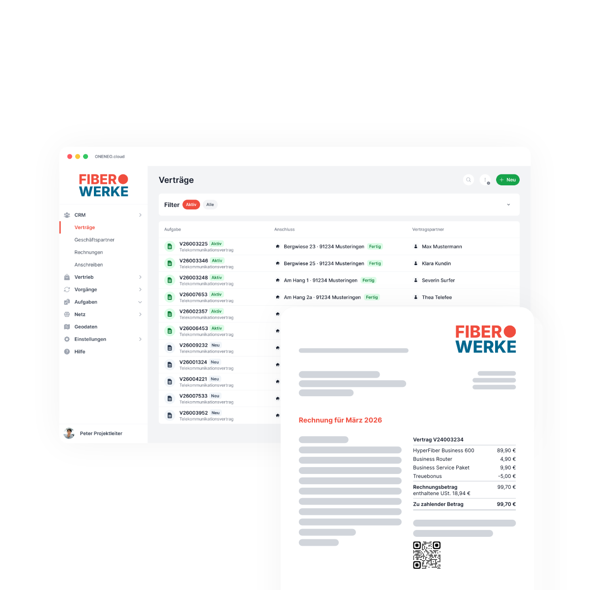 Von der Verwaltung sämtlicher Telekommunikations-, Hausanschluss- und Dienstleistungsverträge über das Kundenmanagement bis zum monatlichen Billing von Privat- und Geschäftskunden sowie Open-Access-Partnern: Die ONENEO.cloud integriert vollständiges Customer-Relationship-Management mit 360°-Kundenblick.