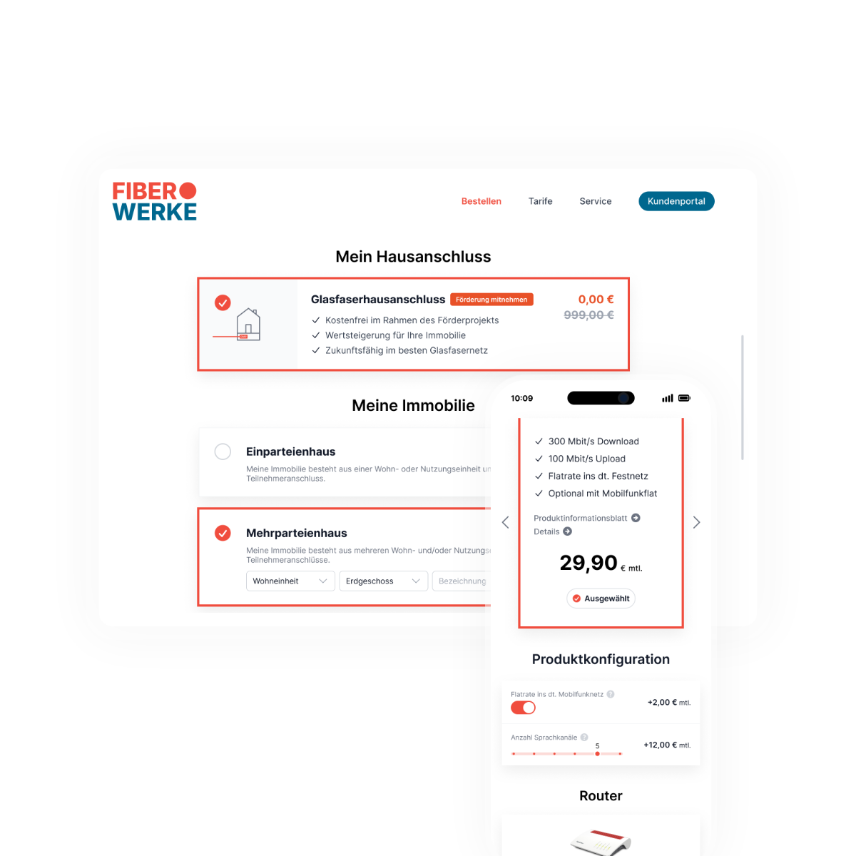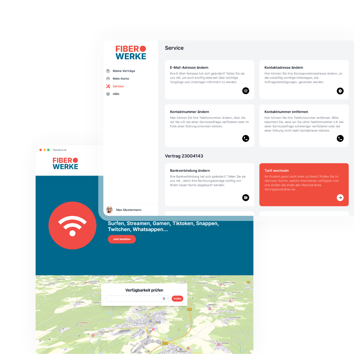 Digitales Kundenerlebnis von der Bestellung bis zum Tarifwechsel: Endkunden erledigen ihre Anliegen ganz einfach selbst. Dank integrierter Online-Bestellstrecken beauftragen Interessenten Hausanschlüsse oder Tarifbestellungen genauso durchgängig digital und automatisiert, wie spätere Stammdatenänderungen oder Bandbreiten-Upgrades im Kundenportal.