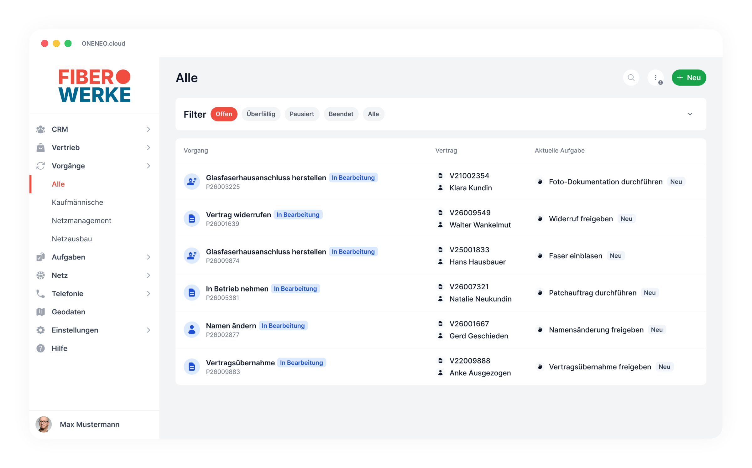 Dadurch entstehen durchgängige, hochautomatisierte Prozesse ohne Medienbrüche – von der Planung bis zum aktiven Anschluss. Die ONENEO.cloud ist damit kein weiteres System – sondern die zentrale Plattform, um Ihr gesamtes Telekommunikationsgeschäft zu managen.